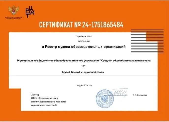 Школьный Музей участвует в районных, городских, областных Российских конкурсах. Награждён грамотами , дипломами победителей и призёров. Руководит работой школьного Музея боевой и трудовой славы с 1993 года учитель истории и обществознания высшей категории, Почётный работник общего образования РФ Любовь Николаевна Соболева.